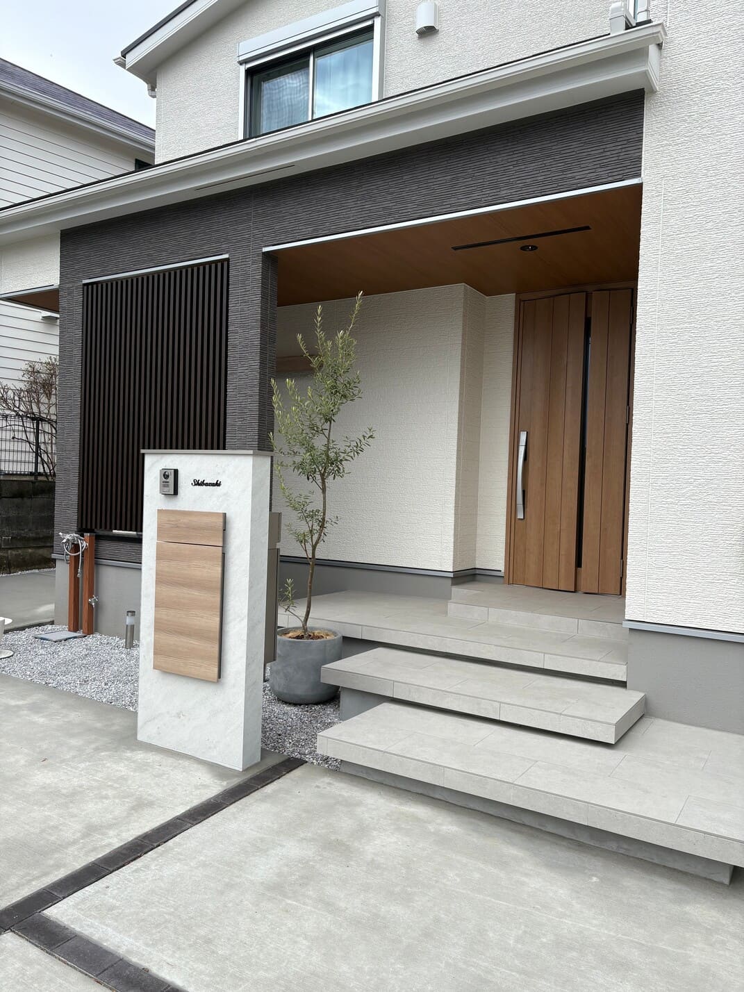 リビング前の囲いのあるテラスは視線をさえぎる効果だけでなく、建物全体をおしゃれに演出しています。