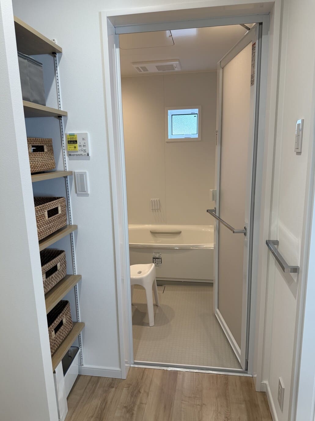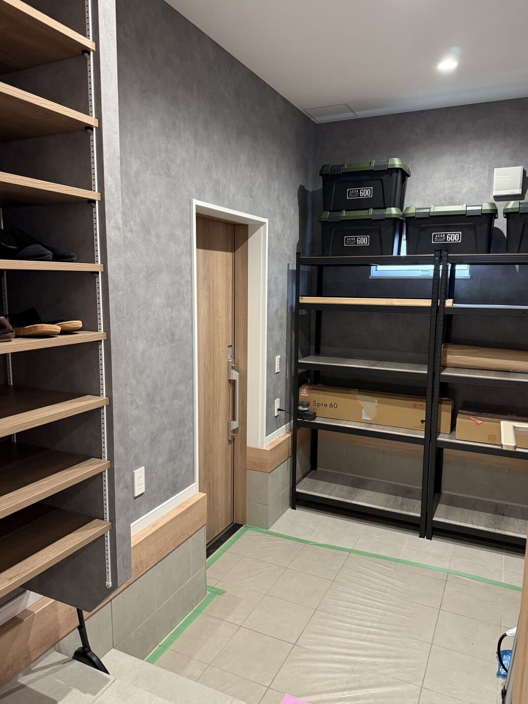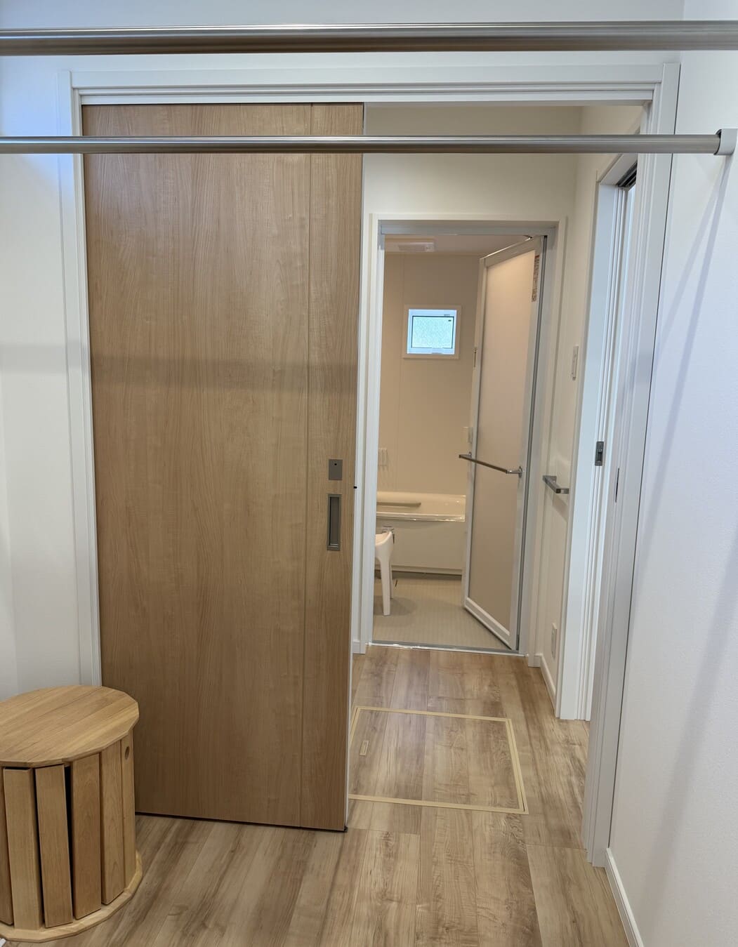 ランドリースペースの3本の洗濯物干し用ポールはそれぞれ違う高さに設置されていて衣類やタオルといったアイテムごとに干せたり、大きめの玄関収納には外から直接入れるドアもあり、用途によって2方向から出入りできるようになっています。