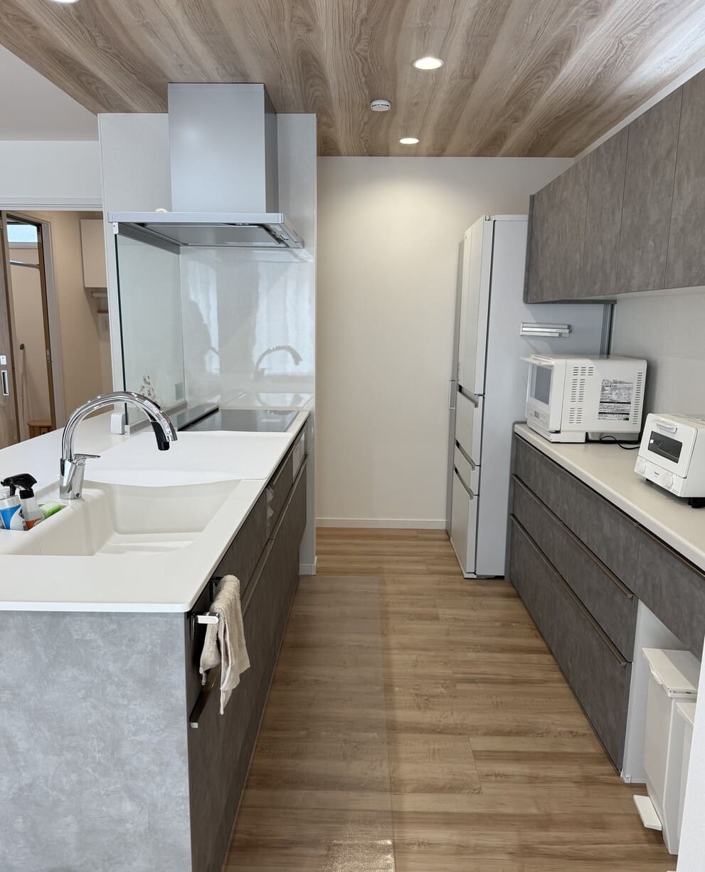 広々とした4台分の駐車場と玄関前のすっきりした目隠しが白いシンプルな外観に調和してワンランク上の機能性とデザイン性を感じさせ、「最高の家ができ上りました」「100%満足です」と施主様がおっしゃるように誰が見ても素敵な家ができ上りました。