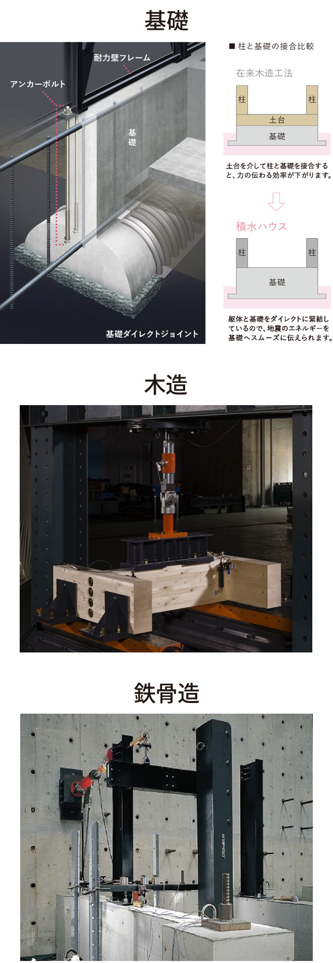 柱と基礎をダイレクトに緊結する「基礎ダイレクトジョイント」を採用し、